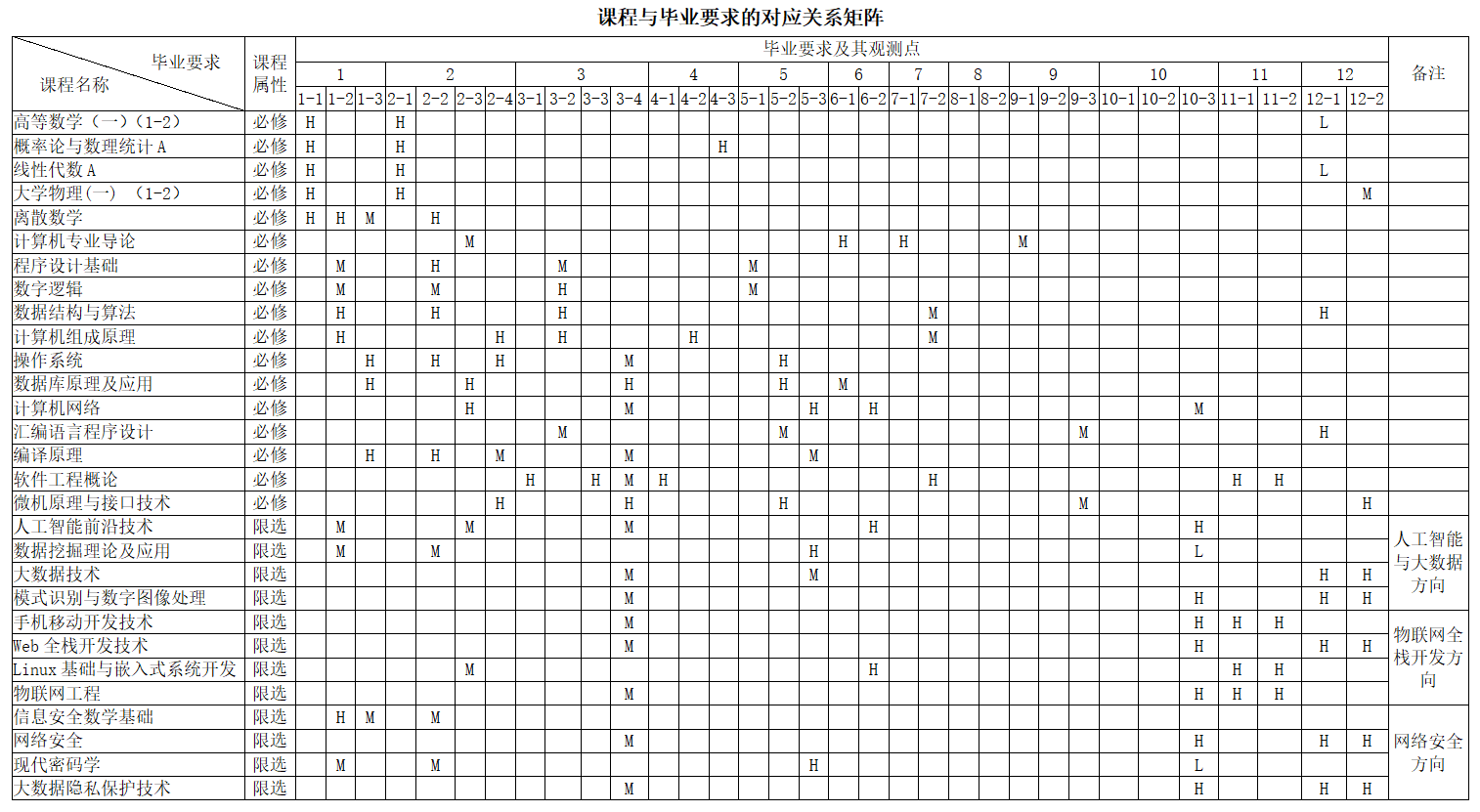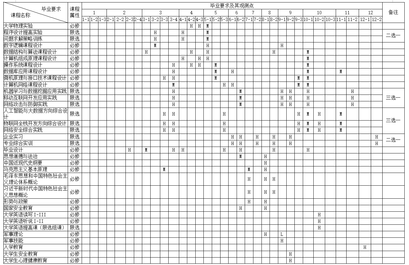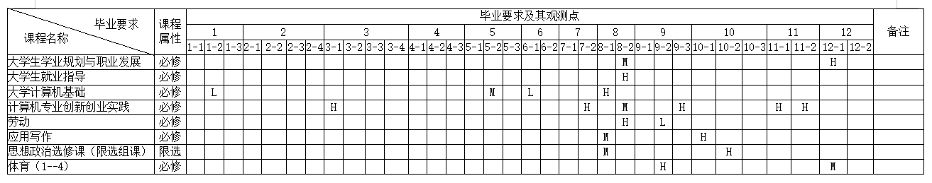 根据课程对各项毕业要求的支撑强度分别用“H(高)、M(中)、L(弱)”表示。