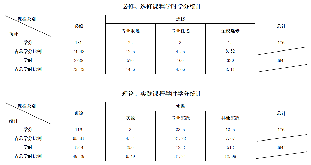 学制四年,修满176学分方能毕业。其中通识教育55学分(含实践15.5学分),专业教育84.5学分(含实践8学分),实践教育36.5学分。