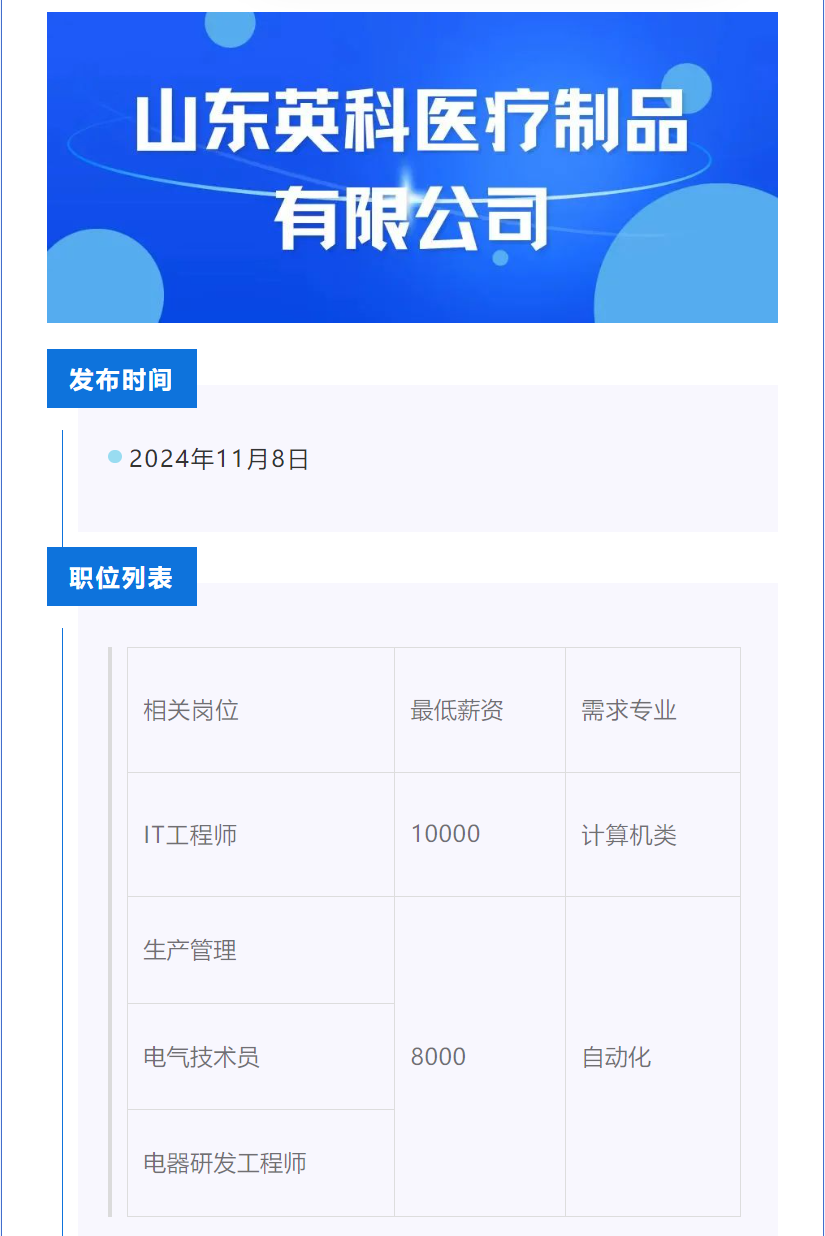 点击文字跳转至山东英科医疗制品有限公司招聘公告