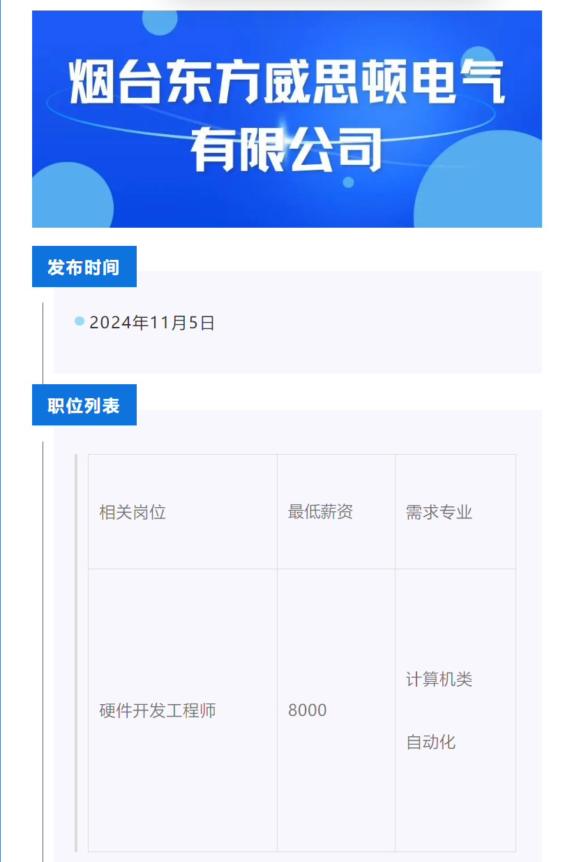点击文字跳转至烟台东方威思顿电气有限公司招聘公告