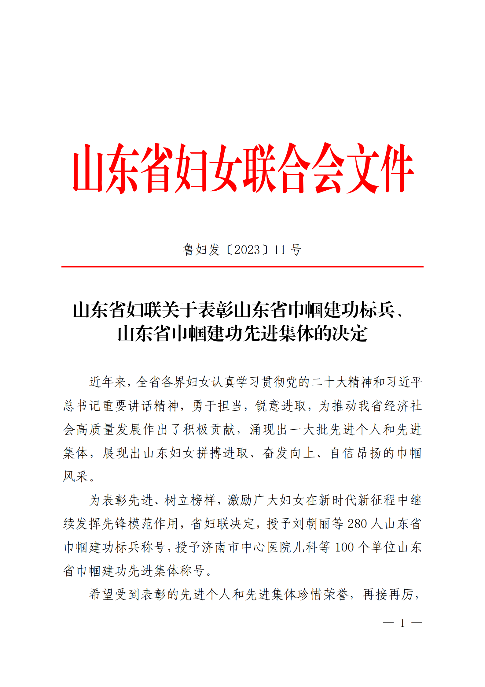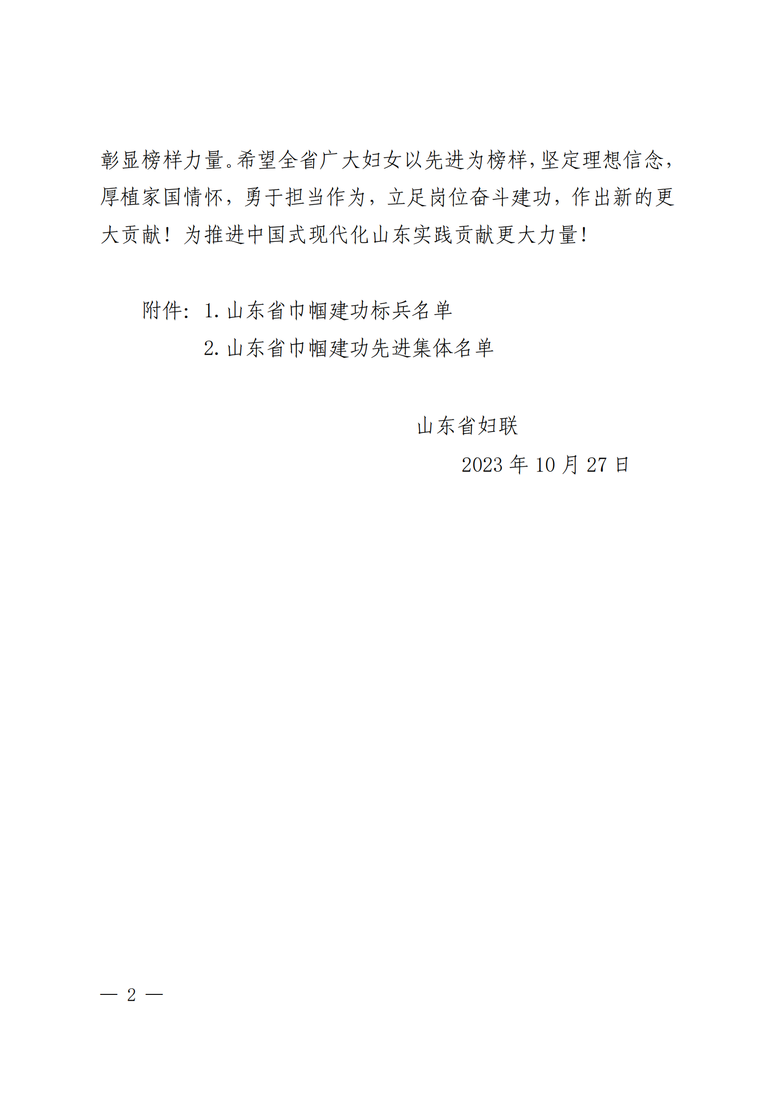近年来,全省各界妇女认真学习贯彻习近平总书记重要讲话和党的二十大精神,勇于担当,锐意进取,为推动全省经济社会高质量发展作出了积极贡献。为表彰先进、树立榜样,激励广大妇女在新时代、新征程中继续发挥先锋模范作用,省妇联决定,授予280人山东省巾帼建功标兵称号,授予100个单位山东省巾帼建功先进集体称号。在此次评选推荐中,经各分工会推荐,公司组织、人事、纪检监察等部门审核通过,党委研究同意等程序确定王莹洁为公司推荐人选。