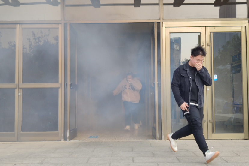 下午3时,消防模拟演练正式开始,公司保卫部工作人员点燃消防烟雾弹并拉响消防警报,公司值班老师和各实验室负责人按照预案,有序组织员工撤离。参加演练的员工用湿毛巾捂住口鼻,低头沿楼梯右侧行进,分别由科技馆东西两侧安全通道疏散至西侧集合区,各实验室负责人迅速清点人数,确保所有员工安全撤离。