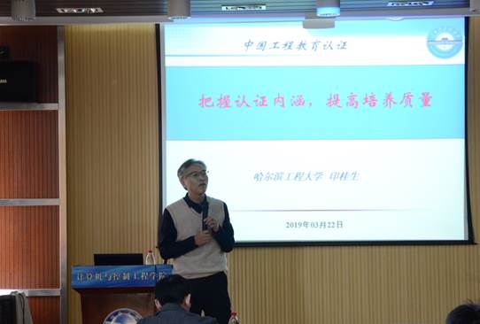 随后哈尔滨工程大学计算机公司经理印桂生教授做了《把握认证内涵,提高培养质量》报告,他以“为什么开展认证?”为切入点介绍了工程教育专业认证的重要意义;深入浅出地介绍了认证的“员工中心、产出导向、持续改进”三大核心理念;从“员工、培养目标、毕业要求、持续改进、课程体系、团队队伍、支持条件”等七个方面详细介绍了认证标准常见问题;利用具体实例介绍了对复杂工程问题的理解;并对工程教育专业认证的流程和重点进行了详细解读。
