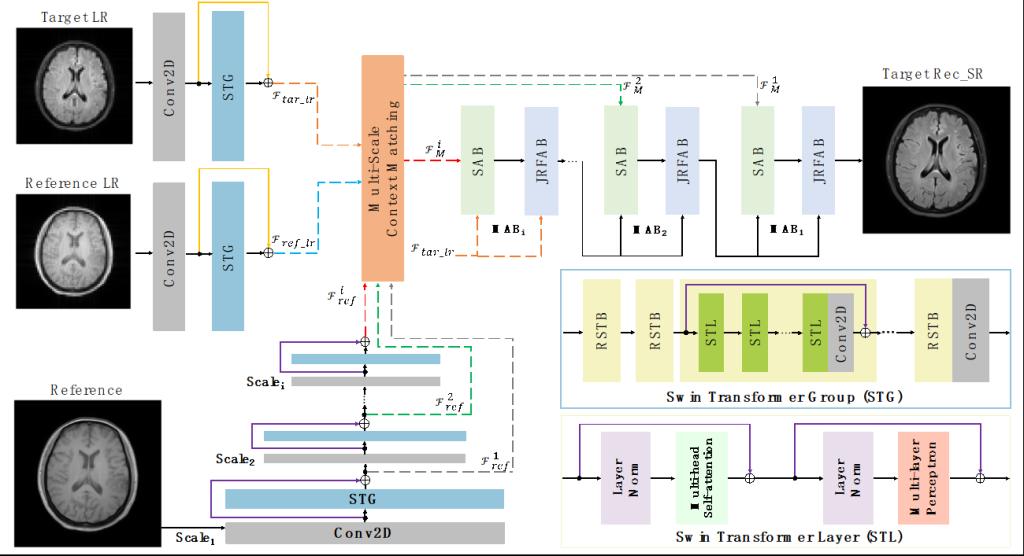 该论文提出了一种新型的由Transformer赋能的多尺度语境匹配和聚合网络,用于多对比度MRI超分辨率重建。该模型可以充分利用参考图像中的补充信息,并能重建出接近于原始目标高分辨率质量的图像。具体来说,本文提出的方法通过多尺度语境匹配和聚合不同尺度的参考特征,为目标低分辨率特征提供足够的补充信息。实验结果表明,本文的方法优于目前的多对比度MRI超分辨率方法,有望在临床医学中得到应用。