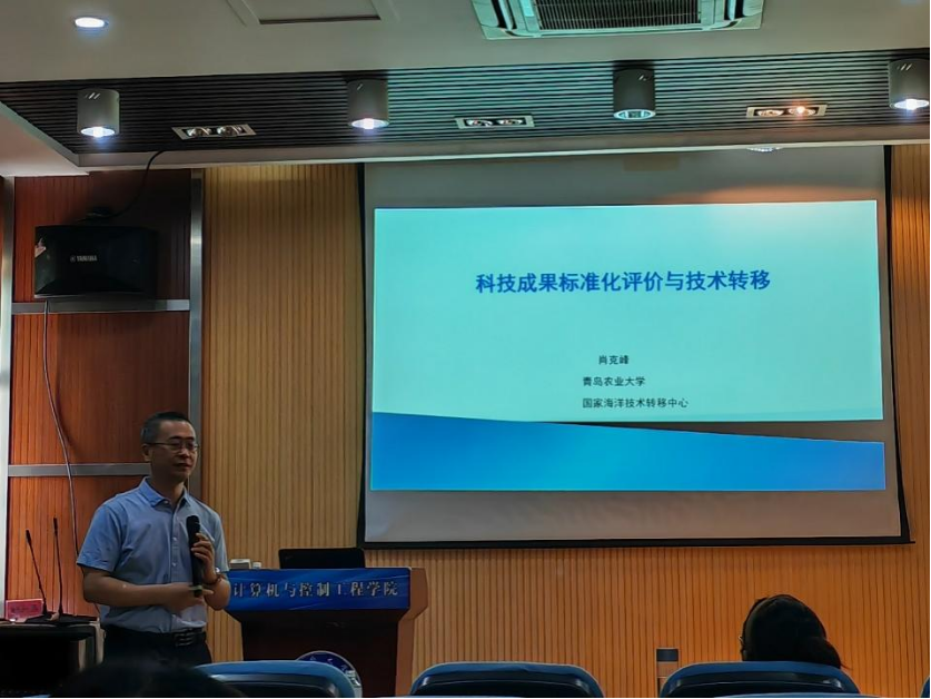 9月5日下午,国家海洋技术转移中心特聘专家、青岛农业大学肖克峰副教授应邀为公司师生作了题为“科技成果标准化评价与技术转移”的学术报告,科技处张立雨、姜滔老师,公司科研骨干和研究生参加报告会,副经理王莹洁主持。