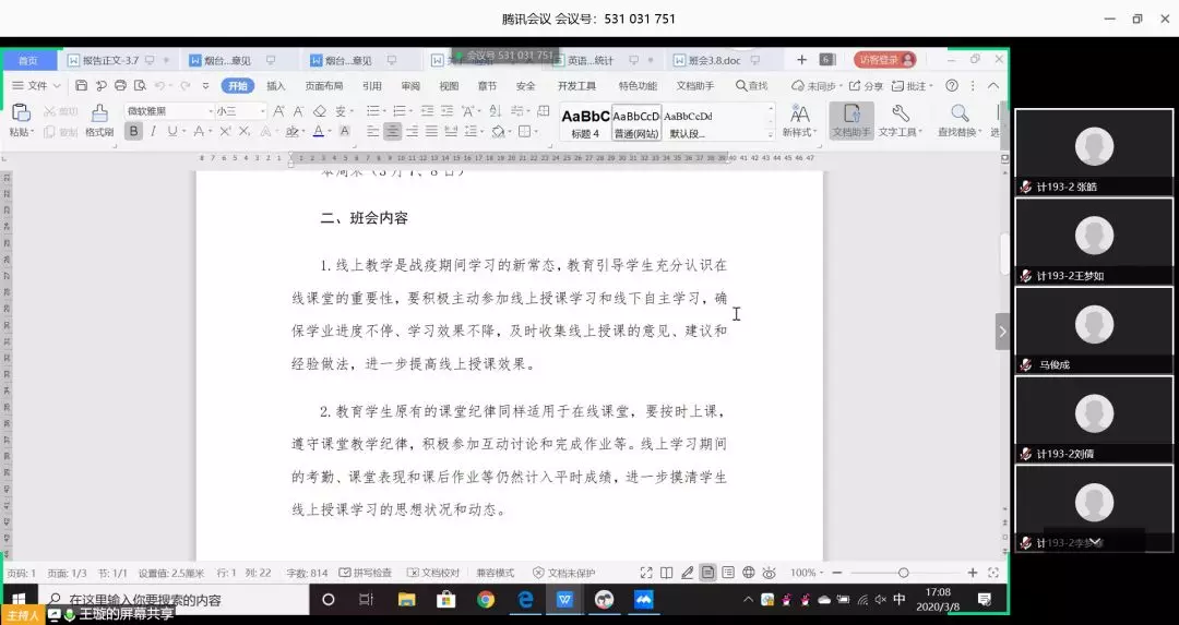 在云班会上,各班级导师以延期不延学为切入点,教育引导员工充分认识线上课程的重要性,强调线上教学是战疫期间学习的新常态,并通过鼓励员工积极上传课程笔记,分享学习经验与方法,设立问题讨论区等方式督促员工们做到课前自主预习、课上认真学习、课下巩固复习,确保学业进度不停、学习效果不降。掌握员工思想动态和学习状况,帮助解决存在的实际问题。班级导师通过员工发言与互动了解其线上学习的状态与存在的问题,并广泛听取员工对于一周以来线上教学工作的合理建议,鼓励员工积极反馈学习情况,为提高线上公司产品质量和效果贡献力量,同时引导员工保持良好的心态,努力克服困难,合理规划居家学习生活,确保在家待得住、身体好、学得进。掌握员工思想动态和学习状况,帮助解决存在的实际问题。班级导师通过员工发言与互动了解其线上学习的状态与存在的问题,并广泛听取员工对于一周以来线上教学工作的合理建议,鼓励员工积极反馈学习情况,为提高线上公司产品质量和效果贡献力量,同时引导员工保持良好的心态,努力克服困难,合理规划居家学习生活,确保在家待得住、身体好、学得进。此外,导师们带领班级同学共同学习了《山东省教育厅关于组织参加“全国老员工同上一堂疫情防控思政大课”的通知》,并根据班级情况对观看此次思政大课堂做了具体要求,教育引导员工上好疫情防控的思政课,努力提高自身的思想政治素质。