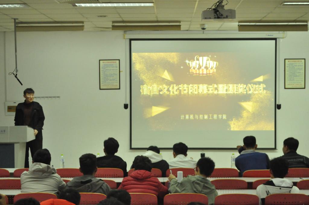 本次闭幕式主要以优秀宿舍成员代表答辩的形式展开,各宿舍按照抽签顺序依次上场,分别从成员介绍、宿舍简介、宿舍风采三个方面进行答辩。他们通过PPT的形式向大家介绍宿舍文化装饰以及宿舍日常生活,向大家展示了温馨、和谐、友爱的宿舍氛围,获得了评委和观众的一致好评,现场掌声如潮。为了充分活跃现场气氛,答辩会中途进行了记忆动作小游戏,台上同学滑稽的表情和搞怪的动作引得全场笑声不断,将现场气氛推向高潮。答辩结束后,现场评委分别为在宿舍征文比赛、摄影大赛、禁烟广告以及寝室装饰设计等系列活动中获奖的个人与宿舍进行颁奖并合影留念。最后,员工会主席寇敬辉作总结发言,他表示,宿舍是一个集体,需要大家共同努力营造良好的宿舍氛围,并希望同学们在接下来的学习生活当中,充分发扬宿舍“团结友爱、互帮互助”的精神,共同努力,共同进步。至此,本次活动圆满落幕。