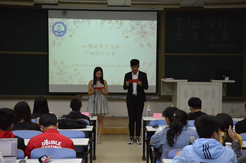 本次比赛分为线上线下两部分,由线上投票与线下设计答辩组成。比赛开始。各参赛选手分别从内容介绍、思路来源、作品内涵和启示与拓展四个方面开始答辩。其中,三号选手从"色彩筑梦,七彩心理"的原理出发,以生活中的酸甜苦辣为背景结合《北京女子图鉴》构成设计理念。她将一个代表员工们从幼而长的成长过程的小女孩与美丽与智慧的化身樱花融合,展现了在成长过程的点点滴滴,寓意即使在道路上有坎坷,只要心理健康坚强,就必定勇往直前。"化身孤岛的鲸"主题作品吸引了到场同学的目光,作品以同名歌曲出发,以蓝鲸为媒展现当下浮躁社会中人们心理的孤独,呼吁同学们勇于解决处理问题,打破困扰。而七号选手独出心裁,设计出情侣T恤,引用电影中的名句"I will always be with you",使T恤充满温情。选手们认真准备,着实为在场观众带来一场创意与视觉盛宴。在分团委员工会书记彭友程发言后,本次比赛圆满结束。杨志远、郭茹获得二等奖,让孝迪荣获一等奖。