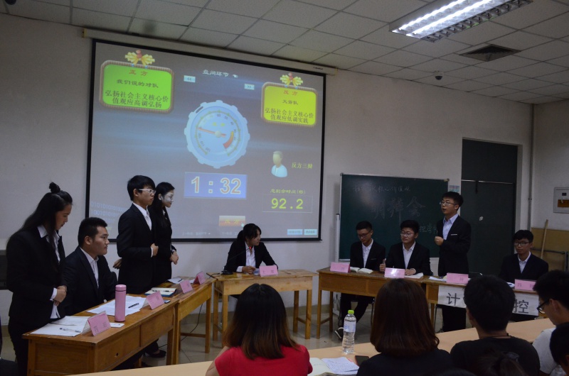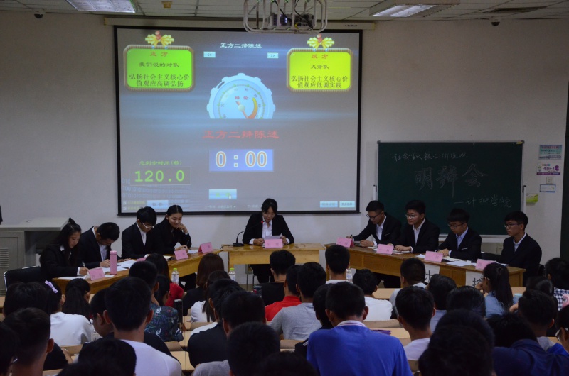 本次明辩会有2017级各班十名代表参加,旨在通过高年级辩手的精彩辩论,促使新生了解辩论赛流程和注意事项。在全体人员准时签到入场后,明辨会正式拉开了序幕。首先,由主持人宣布辩题,辩手们针对“弘扬社会主义核心价值观,高调弘扬和低调实践哪个重要”的辩题组成了正反双方队伍。之后,正方辩手以“只有高调弘扬价值观才能利用有限的时间影响到更多人”为切入点发起攻势,反方则从“实践是一切的基础”出发,将对方的言论层层剖析。在随后的攻辩环节中,正方引用了雷锋精神等论据支撑自己的观点,而反方则通过“伪公益”、“假好人”的例子加以反驳,双方争锋相对,现场气氛迅速升温。接着进入到自由辩论环节,双方在3分30秒内互相对驳盘问,精辟的措辞将全场气氛推至高潮。总结陈词的环节过后,辩手们针对新生提出的疑问进行详细解答,本场辩论赛圆满结束。最后,由员工会书记彭友程上台发言,他指出“辩论赛共分为立论陈词、攻辩盘问、自由辩论和总结陈词四个环节”,并表示希望同学们能积极参与此类活动。至此,本次新生明辩会在全场热烈的掌声中落下帷幕。