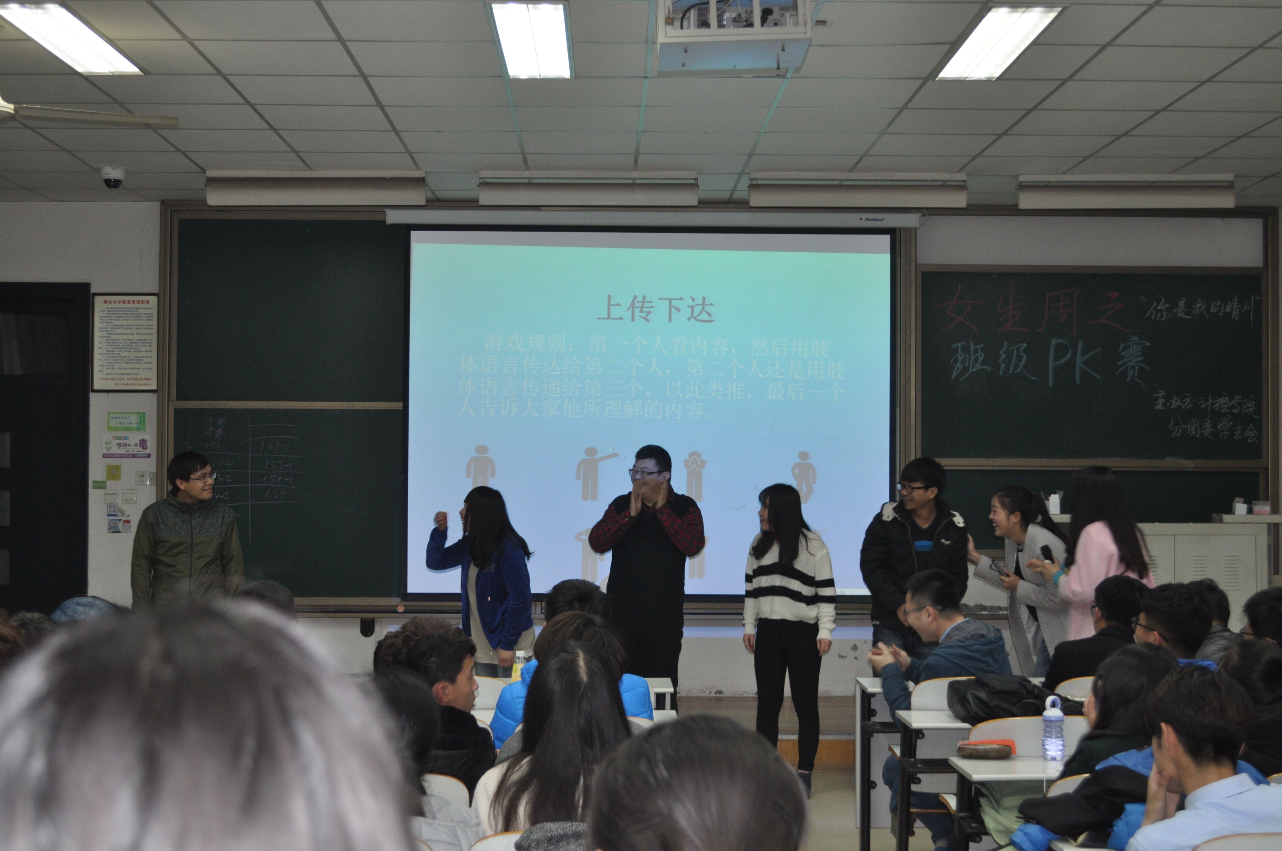 活动伊始,两位主持人的开场白带动了全场的气氛,在对到场嘉宾和评委做了简短的介绍之后,主持人宣布比赛正式开始。随后,各班代表按照抽签顺序依次上台进行答辩,以视频或PPT的形式介绍了本班级女生周活动的内容,如帮女生占位、完成女生们写在卡片上的心愿、为女生提供送早饭到宿舍服务等。答辩结束后,相关人员开始计算各班级最终得分。在此期间,进行了“上传下达”游戏,辅导员庞磊、蔡新海参与其中,老师和同学们的默契配合引起在场同学阵阵欢呼,将现场气氛推向高潮。随后,庞磊老师对本次活动做出总结,他表示本次活动举办的意义在于各班级之间的相互促进而非比拼,并呼吁男生们应将对女生的关心变为常态化,同时对全院女生献上了女生节的祝福。最终,154-1班荣获桂冠,152-2班获得二等奖,152-1班获得三等奖153-2班获得最佳创意奖,156-1班获得最佳组织奖,155班获得最佳人气奖。