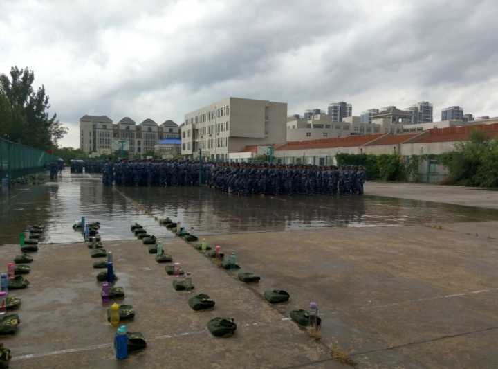 没过一会,就有雨点飘落,同学们正在站军姿,雨滴在他们的脸上、眼睛里,但是没有一个人说话乱动,依旧保持军姿,远远看去,像一排排挺拔的小松树。雨渐渐打了一些,雨滴打在脸上微疼,教官没有停止训练的意思,仿佛心照不宣,同学们的脸上也写满坚定。大概30分钟的军姿训练,同学们开始在雨中练习各种分解动作和连贯动作,动作标准,一丝不苟。虽然在下雨,但是女同学巾帛不让须眉,即使前几天训练很辛苦,也没有一人请假,并且表现得出类拔萃,获得了教官的一致好评。