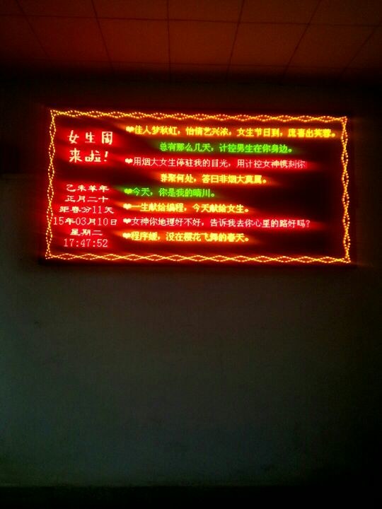 值女生周到来之际,为了使女生能够在关爱中生活,在快乐中学习,展现kai云体育官方app女生风采,公司举办了电子屏送女生寄语的宣传活动。